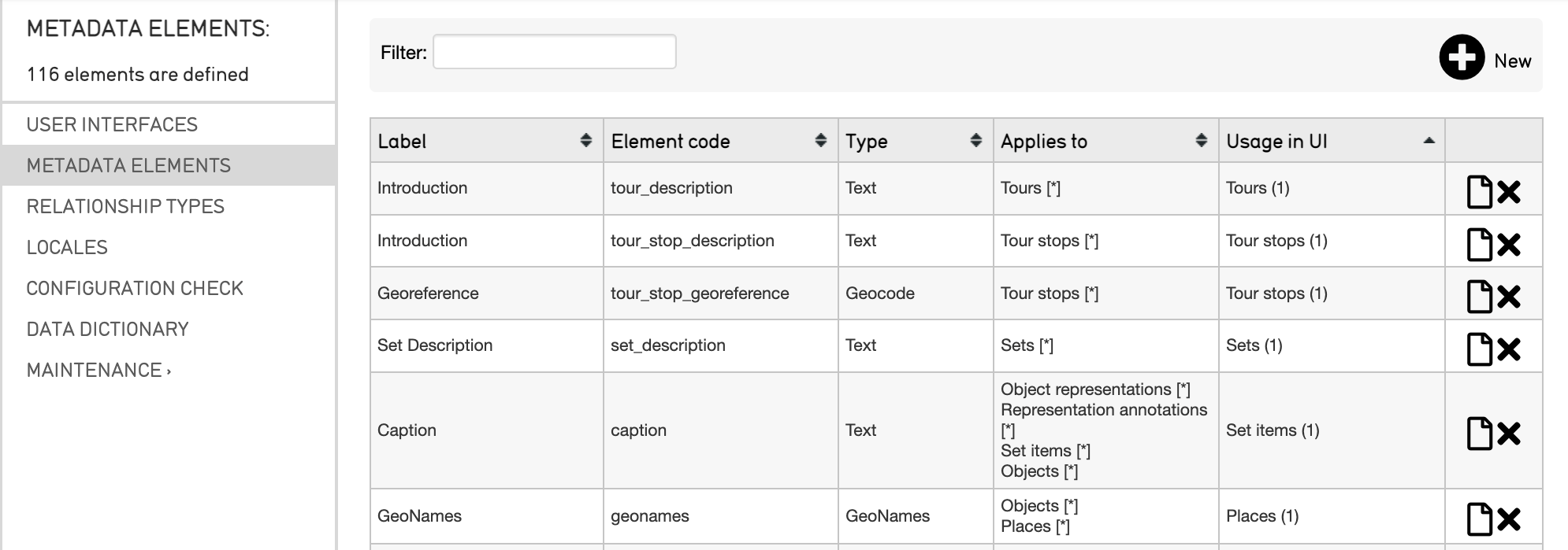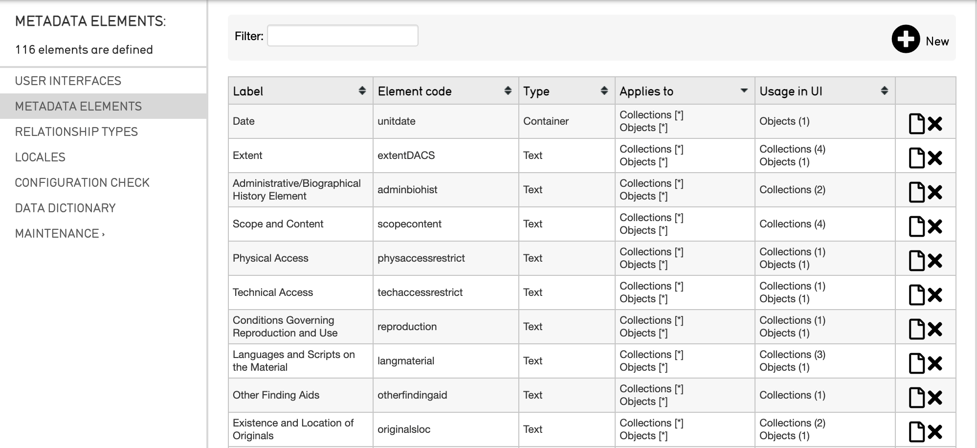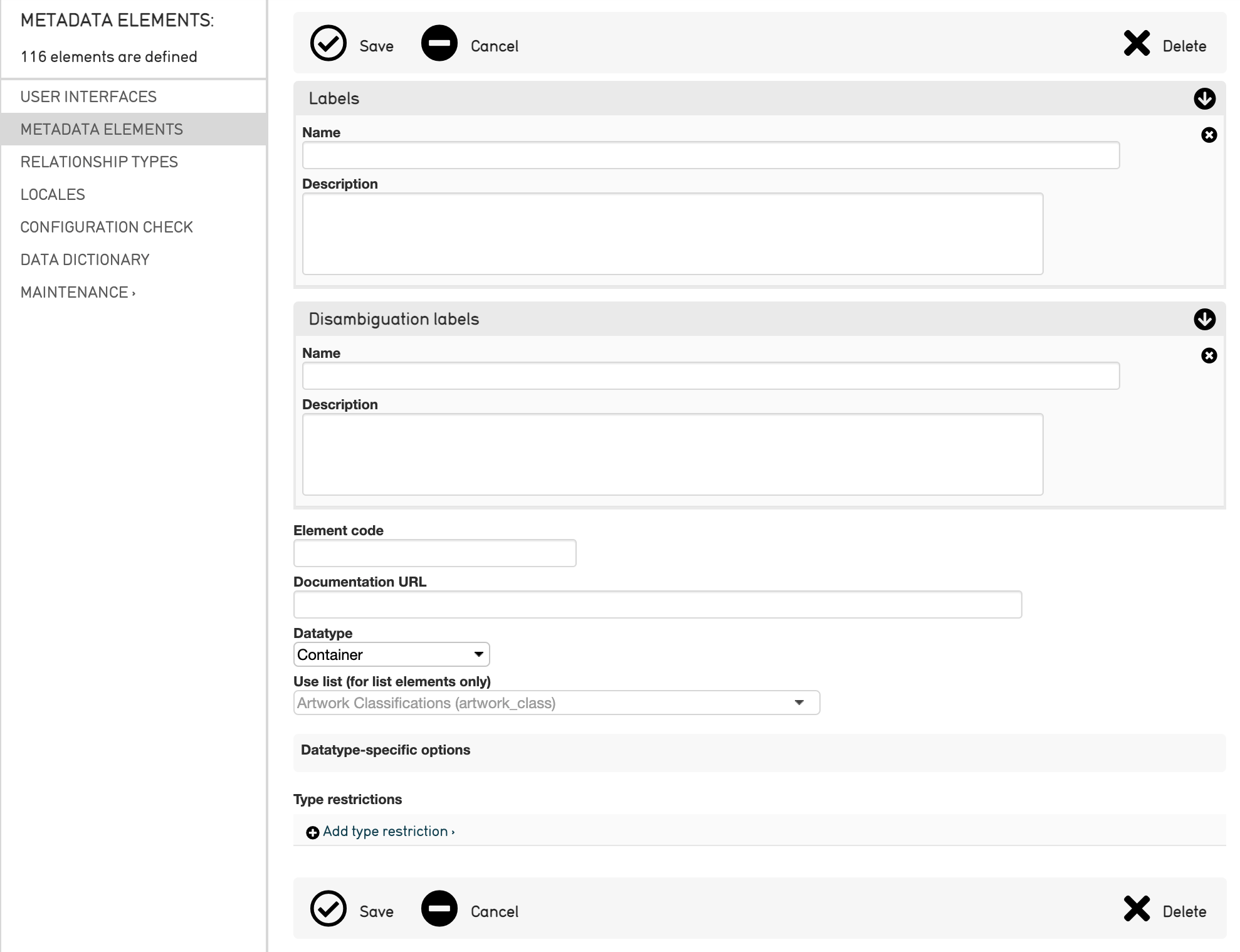 Metadata elements can be created and edited through the CollectiveAccess interface.