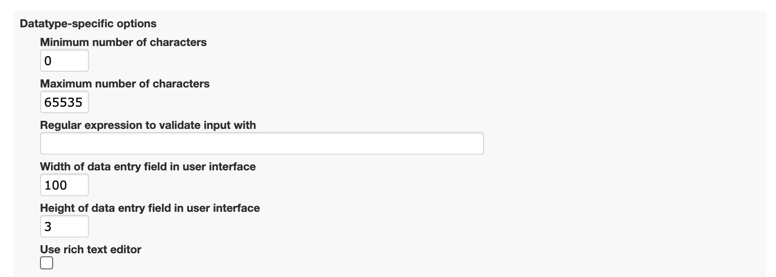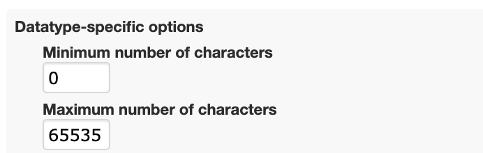 To update or change the amount of text the field can hold, scroll down to the section Datatype-specific options, within which are various settings: